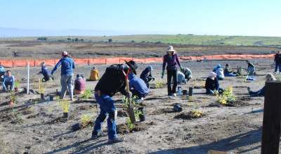 The City of Palo Alto is taking an altogether different approach by building a horizontal levee to protect the shore of Harbor Marsh. It eschews the usual steeply sloped seawall concept entirely. Instead, the coast is to be given a gentle gradient constructed of earth, creating a so-called “ecotone slope”—a long, sloping habitat down to the water line. Where the tide meets the shore, native plantings will support a tidal marsh, transitioning to a freshwater marsh with different plants farther up the slope, with volunteers planting 35 species in all. It’s hoped that restoring these habitats in the area will provide support to species like the Ridgway’s rail and the salt marsh harvest mouse.