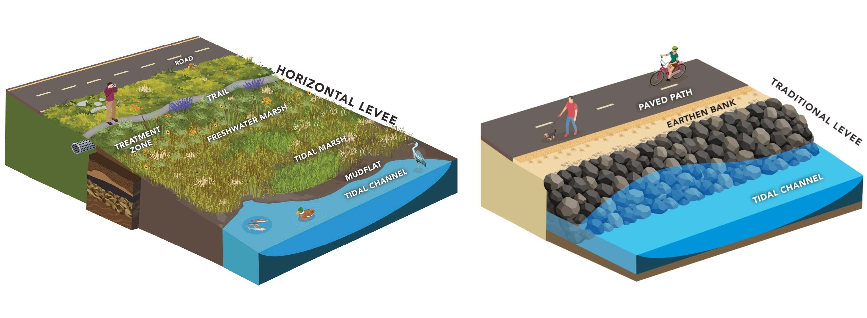 Furthermore, from the top of the horizontal levee, wastewater will be fed in to support the growth of native plants, which will work with the soil to filter out pollutants as it makes its way to the sea in a process referred to as “polishing treatment”. It’s not intended to remove heavy pollutants from the water; this work is handled at existing municipal water treatment facilities. What the levee can handle is soaking up some of the nitrogen and phosphorous content to support plants on the slope. This reduces the amount of these nutrients that gets released out into the bay, which can cause fish die-offs, algal blooms, and other undesirable consequences.
