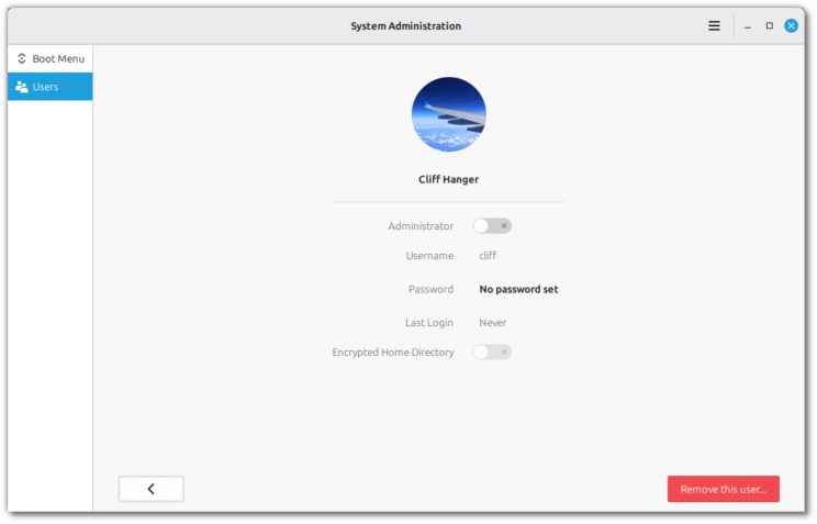 User management in mintsysadm focuses on the most common tasks. Once a user is set up, that user can set up a password and finalize the account without admin intervention. Home directory encryption, which until now was only supported during the OS installation, is fully supported during the creation of new user accounts.