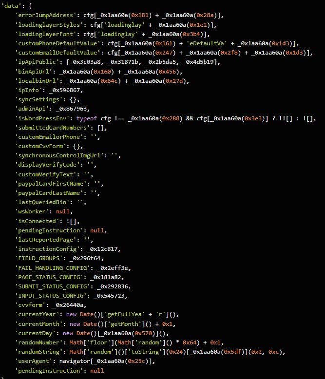Behind the slick UI, the form is connected to JavaScript code that, when the victim hits “Continue,” collects everything they’ve entered and transmits it directly to the attackers. In our investigation, we deobfuscated their code and found a large “data” section.