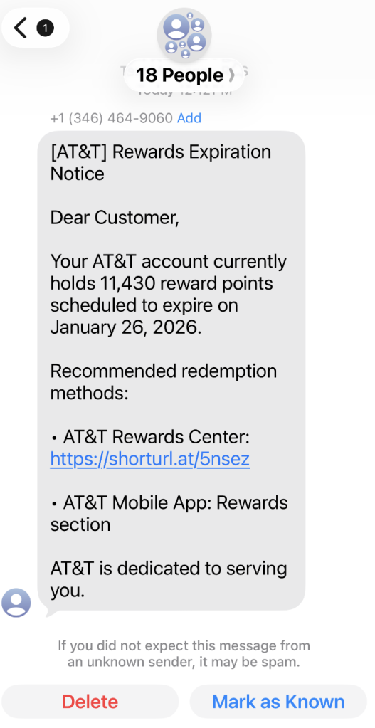 A coworker shared this suspicious SMS where AT&T supposedly warns the recipient that their reward points are about to expire.