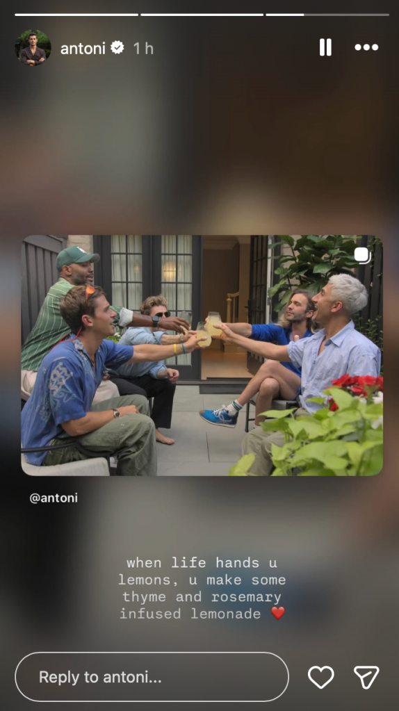 On Wednesday, Porowski alluded to the drama by posting an image to his Instagram stories of the Fab Five (not including Berk) with the caption: “when life hands u lemons, u make some thyme and rosemary infused lemonade.”