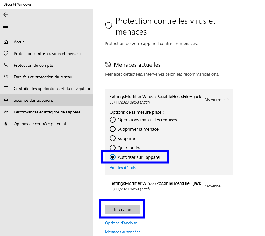 Cliquez sur "Autoriser sur l'appareil" puis le bouton "Intervenir".