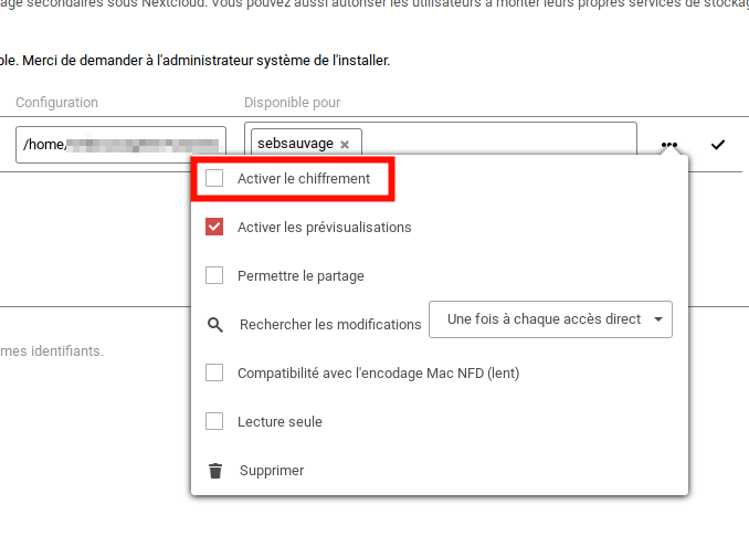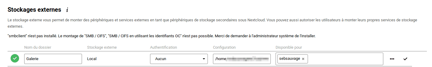 Dans le paramètrage NextCloud : Paramètres > Administration > Stockages externes: