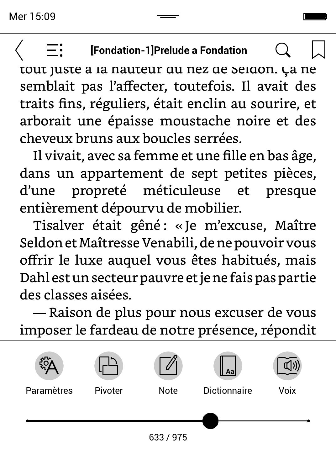 | Outils | | J'ai des outils intégrés très pratiques: Dictionnaires intégrés (Français, Anglais…). Je peux rechercher des mots ou phrases dans le livre entier. |