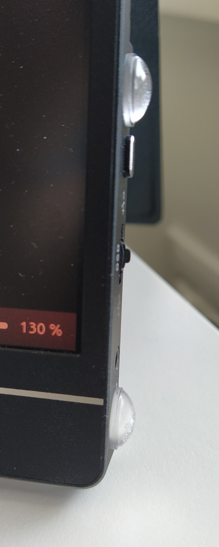 - L'image sur Amazon laisse penser qu'on peut mettre le moniteur en mode portrait. Mais ce n'est pas possible en l'état: D'un côté il y a les connecteurs et de l'autres les boutons OSD. Si on le met en mode vertical, cela appuit sur les boutons. J'ai trouvé une astuce simple : Des patins adhésifs en silicone. C'est laid mais suffisant pour que ça n'appuis par sur les boutons.