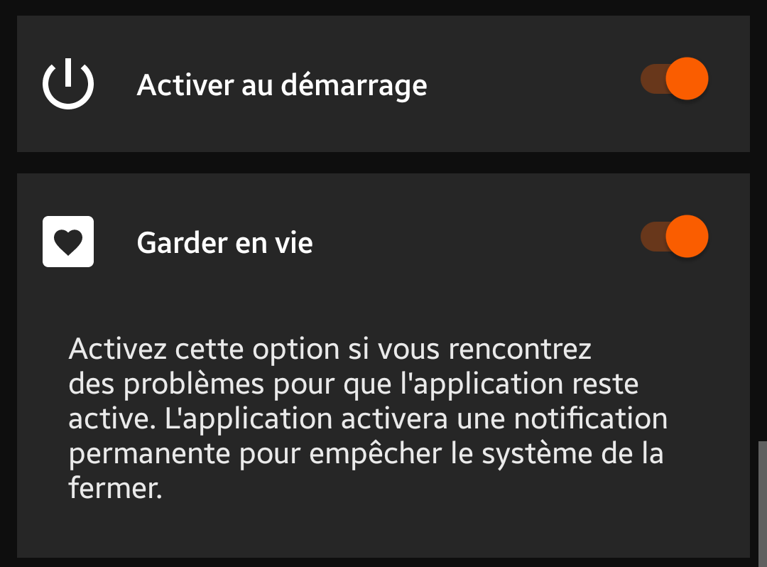 | Écran principal de Blokada | Dans les listes noires, utilisez le bouton pour ajouter cette liste et désactivez les autres listes. | Si Blokada est parfois désactivé, pensez à activer ces deux options dans les paramètres pour empêcher le système de tuer l'application. |