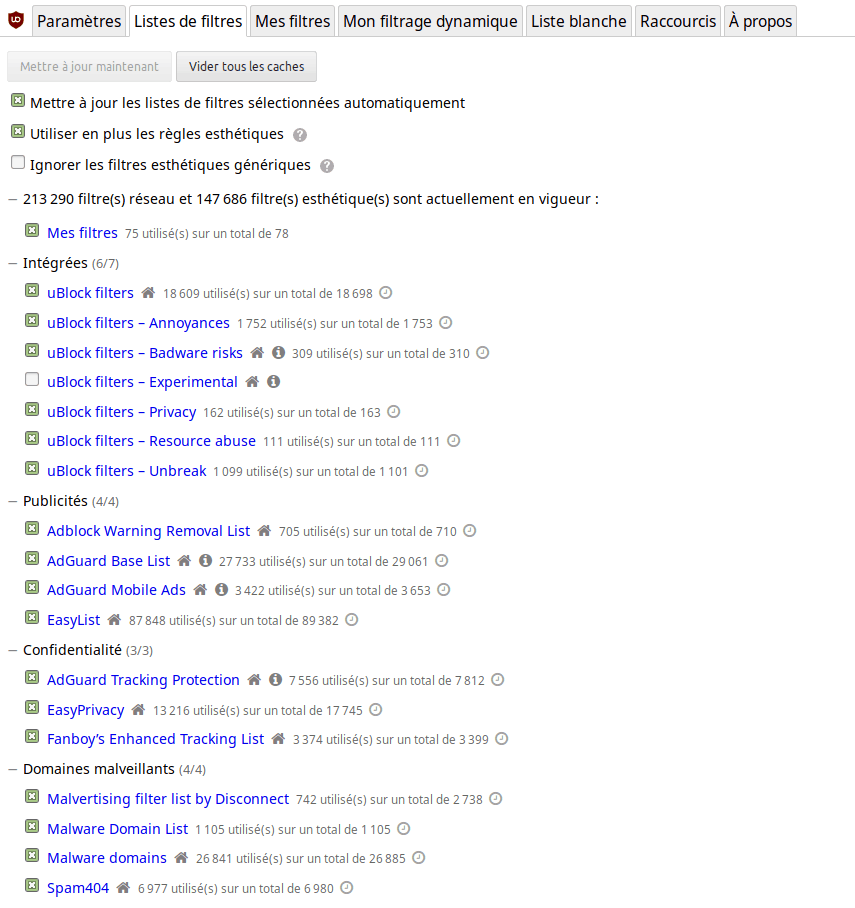 - µBlock-origin, bloqueur de publicités. Très efficace. Bloque au choix publicité, traqueurs, widgets de réseaux sociaux, compteurs… et il est très facile de créer vos propres règles pour dégommer ce qui ne vous plaît pas sur un site web particulier. Mes réglages pour cette extension sont en bas de cette page.