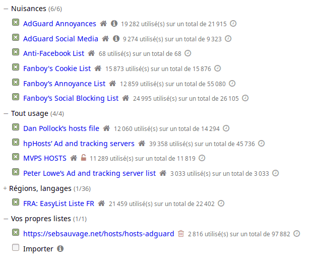 - PrivacyBadger retire les cookies d'identification des requêtes non filtrées par µBlock-origin et Decentraleyes (requêtes nécessaires au bon fonctionnement des pages web ; voir les explications).