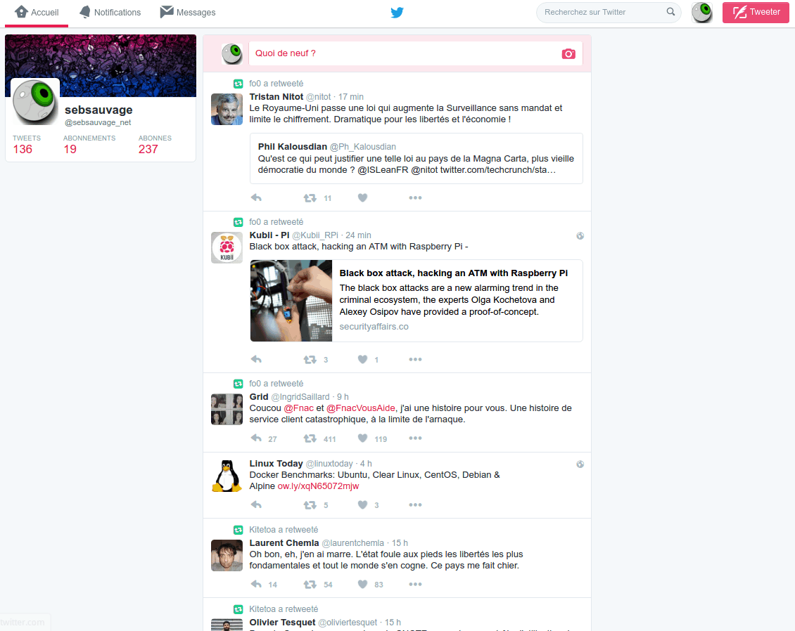 Tout d'abord, je n'utilise pas la "nouvelle" interface web de Twitter, mais l'ancienne, plus facile à filtrer.