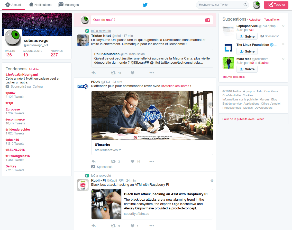 Je ne vais plus trop sur Twitter (@sebsauvage_net), mais pour éviter de se faire polluer quand j'y met les pieds, j'ai des filtres personnalisés (cela retire les «Tags tendances» à gauche, «Suggestions» à droite, les publicités insérées dans votre timeline, les «amis suggérés», les «vous pourriez aimer aussi»…)