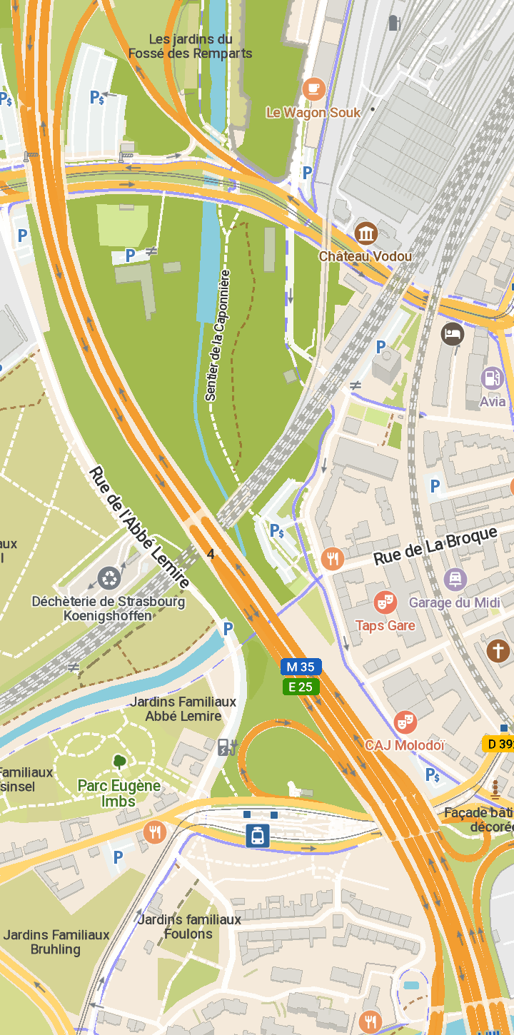 Pour être tout à fait fair-play, certaines applications n'affichent les détails qu'à partir d'un certain niveau de zoom. Voici donc une partie de carte zoomée pratiquement au maximum dans ces différentes applications: