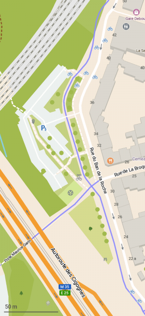 - Contient les chemins de randonnée (GR…) et pistes cyclables numérotées.