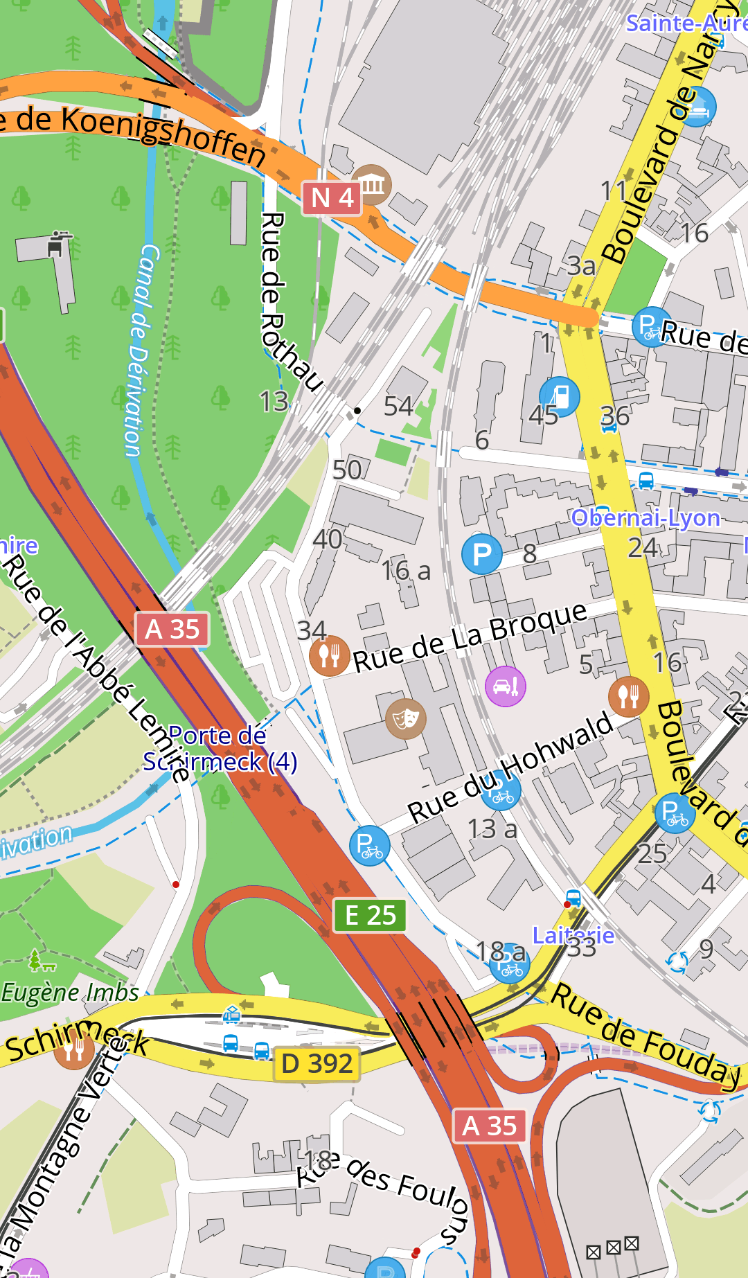 - Les parkings sont bien marqués, mais comme une grosse zone. On ne voit pas les allées de parking (voir les copies d'écran de carte zommée, plus bas dans cette page), ce qui peut être dommage (par exemple pour sortir d'un parking de grande surface labyrinthique).