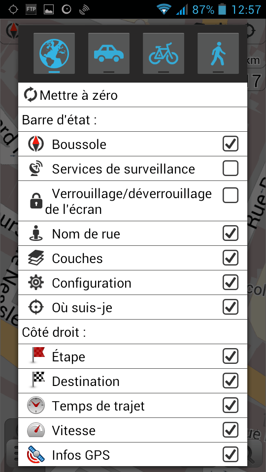 Vous avez la possibilité d'activer/désactiver diverses options pour customiser l'affichage dans chaque profile (normal/voiture/piéton/vélo).