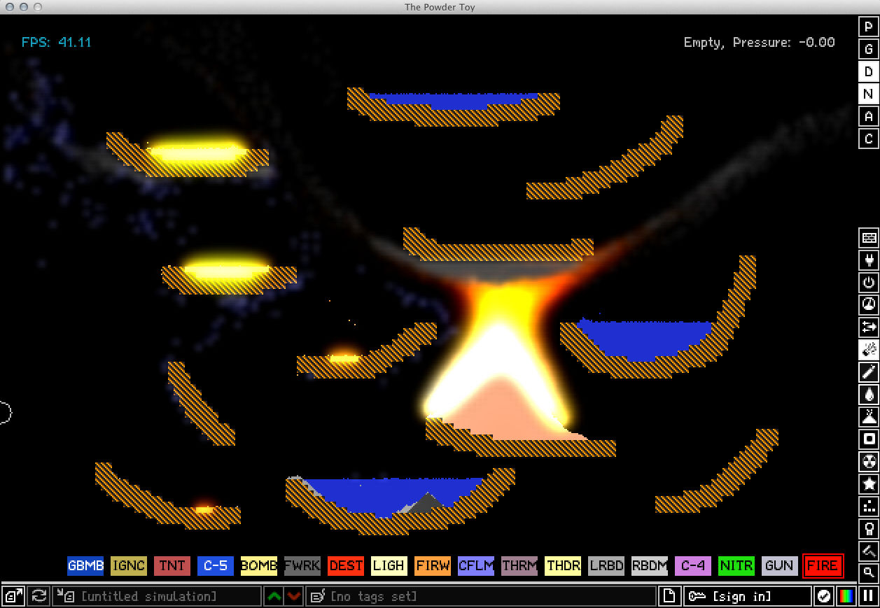 - The Powder Toy (gratuit), simulation de fluides/physique. Un formidable logiciel de simulation: versez poudres, liquides (azote, oxygène…), matériaux… ils réagissent entre eux (gel, explosions, combustion, vaporisation, fusion…). Le logiciel gère la température, la pression, les écoulements… Et il est assez complet pour que certains aient réussit à simuler une centrale nucléaire (avec circuits d'eau, échangeurs de chaleur, etc.)