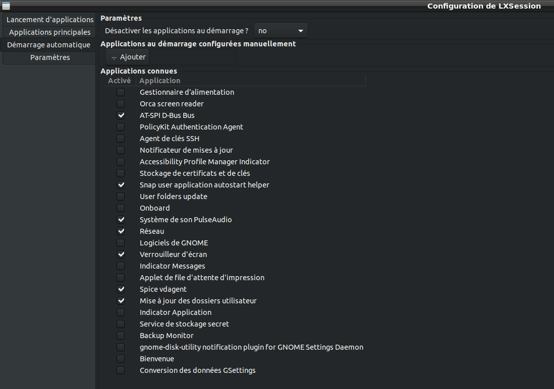 • Alléger les programmes lancé à l'ouverture de la session dans Configuration de LXSession > onglet Démarrage automatique :