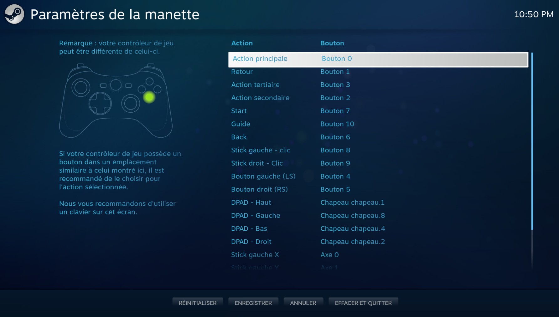 Toutefois, il vous est possible de reconfigurer les boutons de la manette dans Steam : menu Steam > Paramètres > Manettes > cliquer "Paramètres généraux de la manette" > cliquez sur votre manette dans "Contrôleurs détectés" > bouton "Définir la disposition":