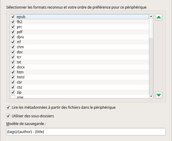 Vous pouvez également faire, par exemple {author}/{title} pour avoir tous les ouvrages d'un auteur dans un même dossier.