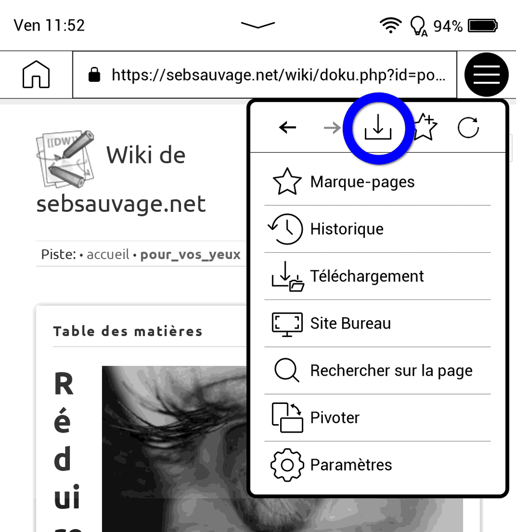 - Ouvre le menu "Sandwich" en haut à droite, puis appuyez sur l'icône "Télécharger" (Cela va enregistrer la page au format .mhtml)
