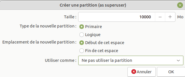 - Cliquer sur espace libre puis le bouton + pour créer une partition. Créer les partitions suivantes: