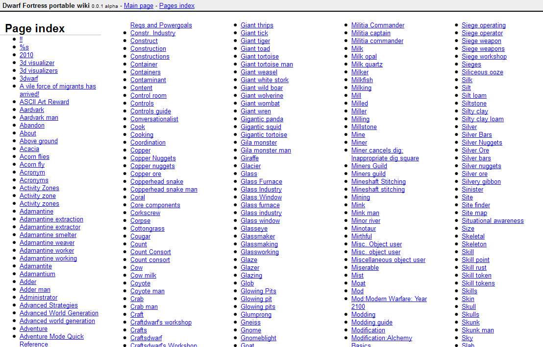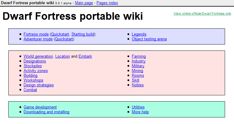 Dwarf Fortress Portable Wiki aims at providing an offline, portable version of Dwarf Fortress wiki (very handy if you don't have an internet access). You can put it on your hard-disk, or on your USB key along Dwarf Fortress.