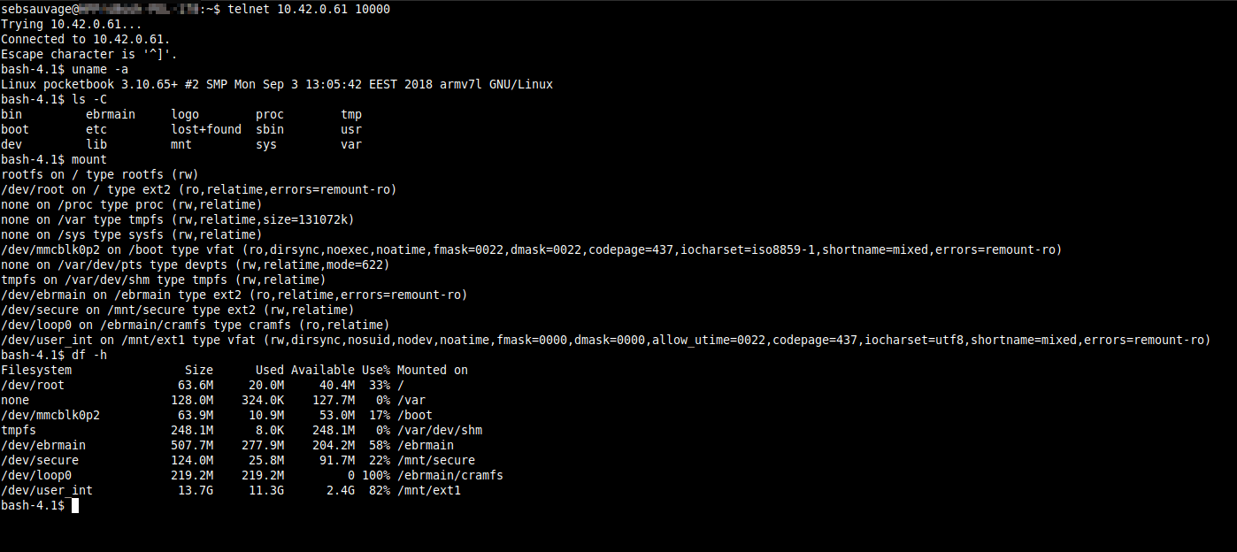 Par défaut, impossible d'accéder à la ligne de commande de la liseuse. Mais il est possible d'installer un serveur telnet. Installez juste ce serveur telnet (source) dans les répertoires qui vont bien (c'est indiqué dans le zip).