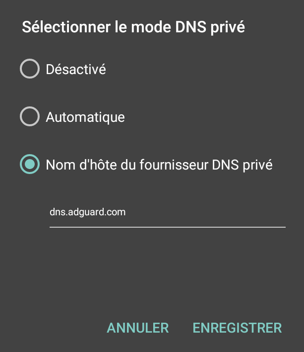 - Sous Android 9 et supérieur, dans la configuration, allez dans "Réseau et internet", "DNS privé" et entrez