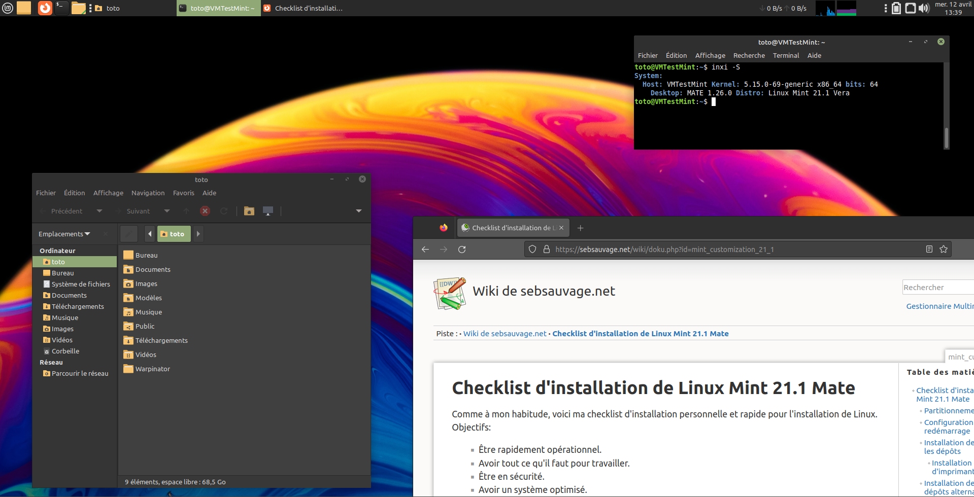 Pourquoi Linux Mint et plus Ubuntu Mate ? Parce que je trouve que les réglages par défaut du système et du bureau sont meilleurs dans Mint, ainsi que diverses autres choses (pas de snaps…).