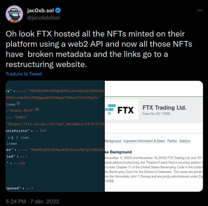 Exemple concret: Oh pouf ! Tous les NFT créés sur FTX ne pointent vers plus rien du tout.