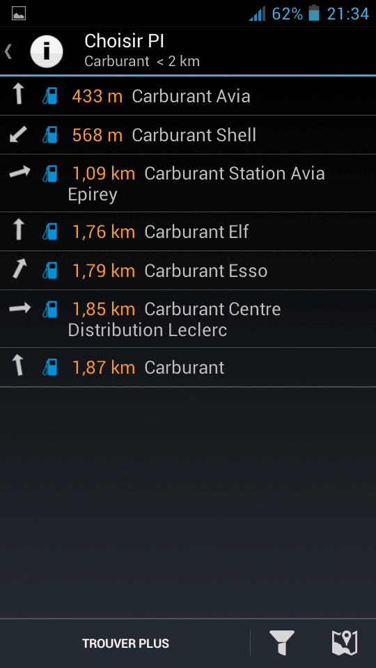 Par exemple "Carburant" vous indiquera les stations service les plus proches, avec leur direction, distance et nom. Si vous voulez plus de résultats, appuyez de manière répétée sur "Trouver plus" pour étendre la distance de recherche.