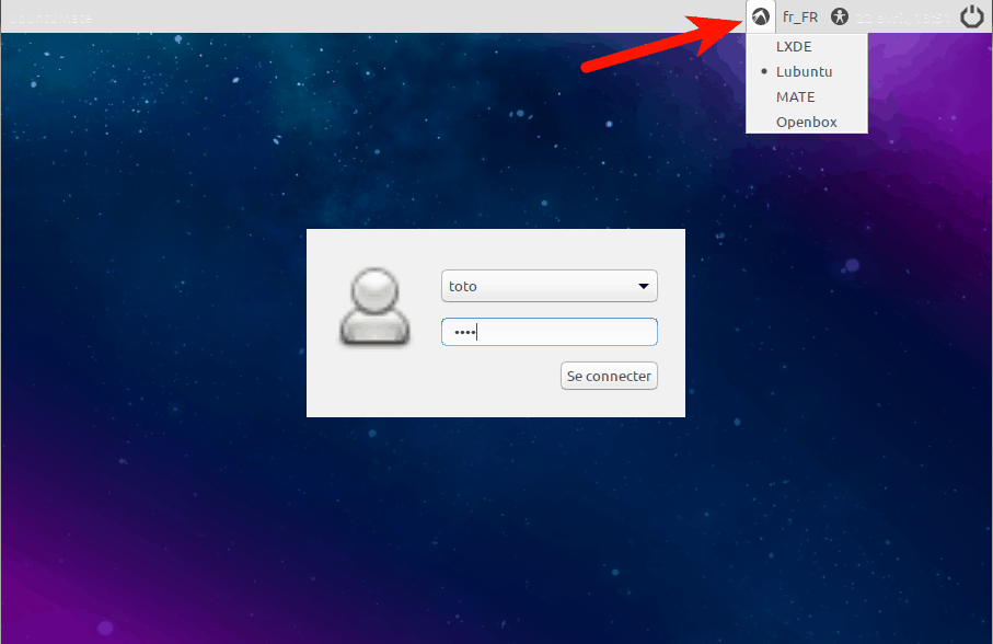 - Dans la fenêtre de login, choisissez "Lubuntu" au lieu de "MATE" et connectez-vous:
