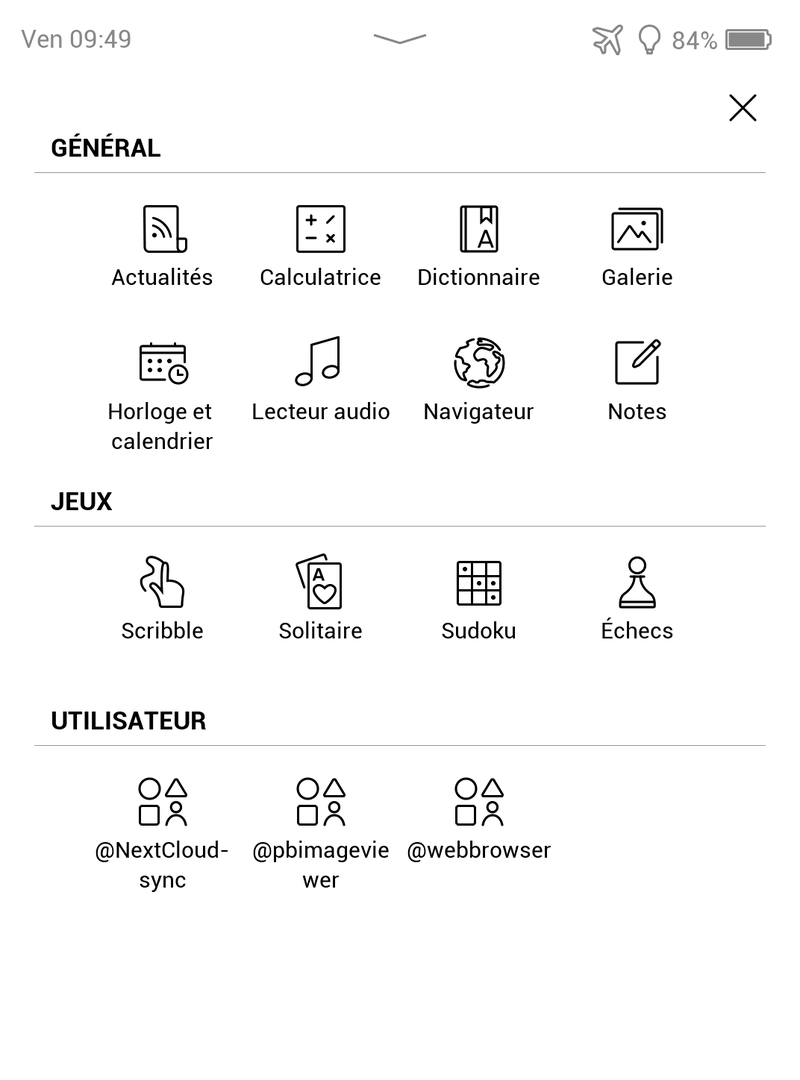 En plus de la fonction "lecture", la liseuse est fournie avec quelques applications: