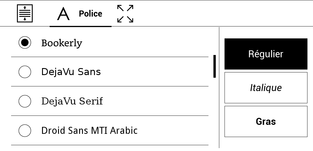 - Bookerly est à mon goût vraiment le meilleur choix. Elle est un peu plus large et plus grasse, ce qui permet une lecture moins fatigante. Amazon a fait un excellent boulot là dessus (cette police avait été développée pour le Kindle).