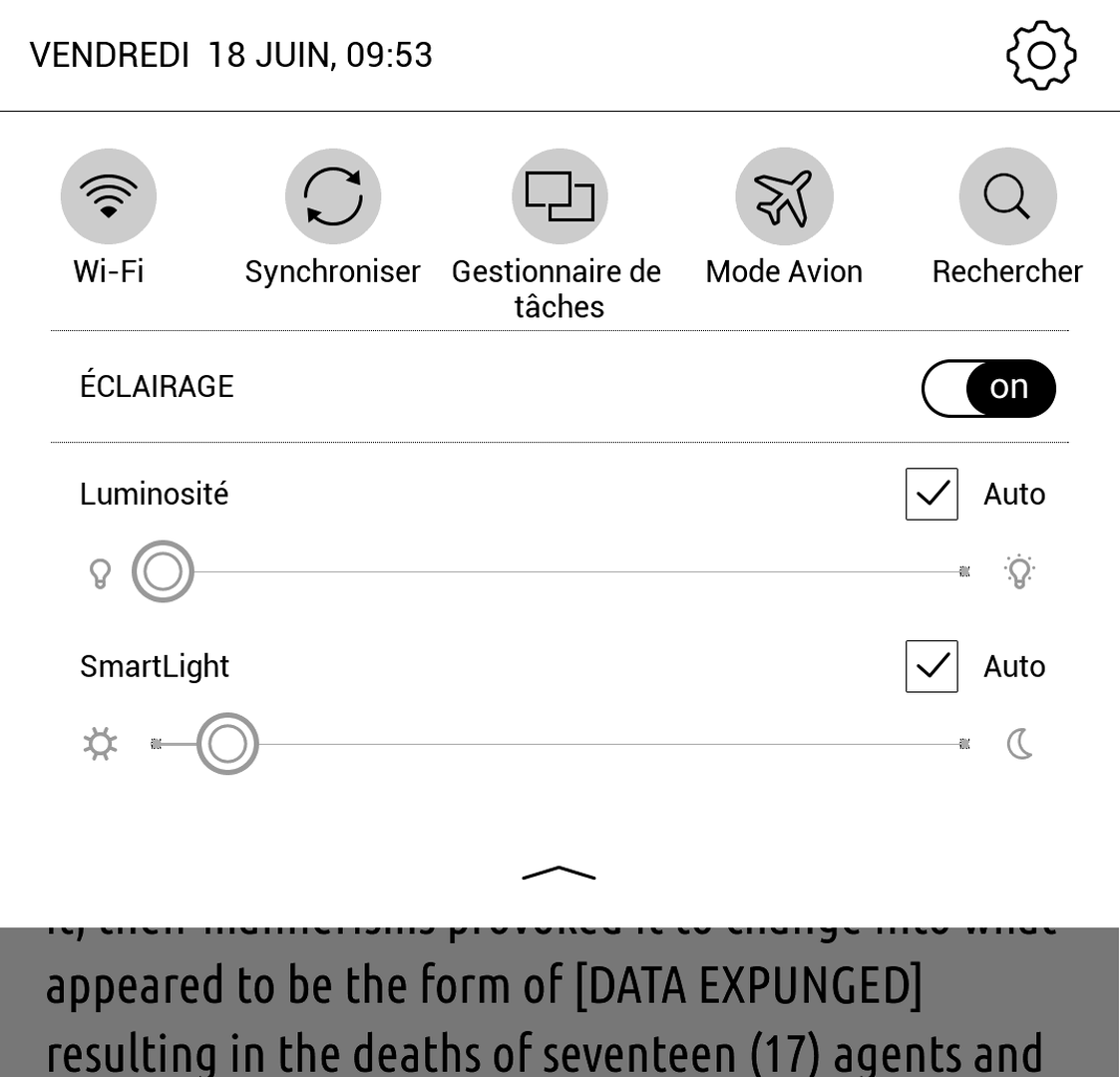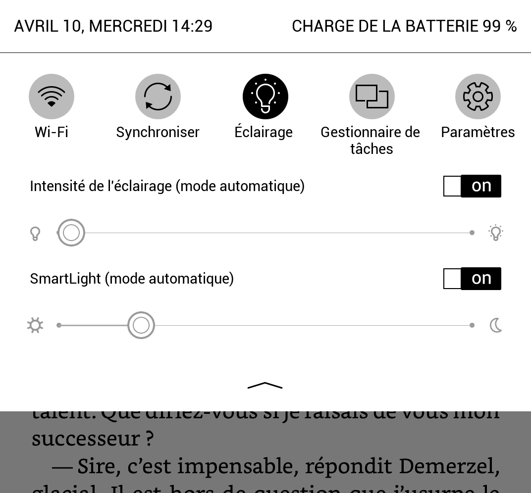 Notez que même si le WiFi est activé dans les options, la liseuse le désactivera automatiquement au bout de 10 minutes s'il n'est pas utilisé (pour économiser de la batterie). Elle vous proposera de le réactiver si vous utilisez une appli qui a besoin d'internet (navigateur, synchro, etc.)