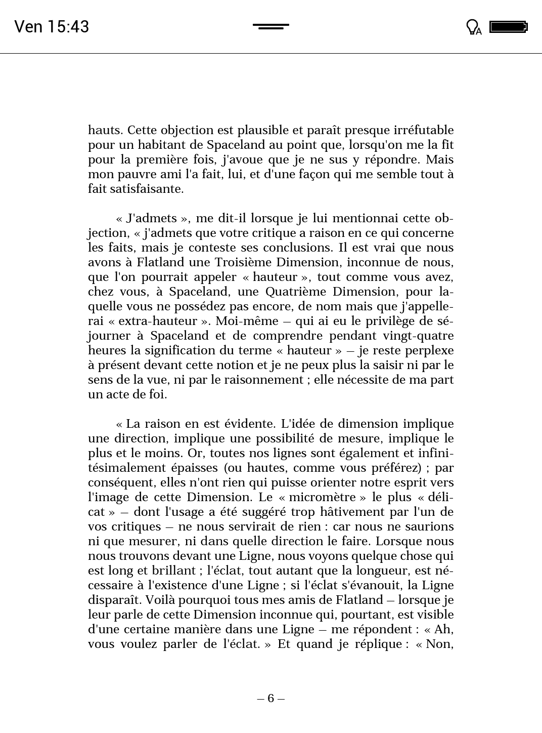 | Mise en page | La mise en page m'est imposée par l'imprimeur. | Je peux faire varier la police elle-même, la taille, l'espacement des lignes, les marges… pour lire le plus confortablement possible. Si vous avez des problèmes de vue, une liseuse est une planche de salut. |