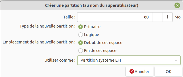 | /dev/sda1 | FAT32 | 64 Mo | Partition EFI pour le démarrage. Obligatoire sur toutes les machines récentes. Cette partition doit avoir les flags boot et esp. |