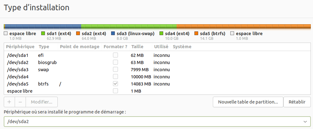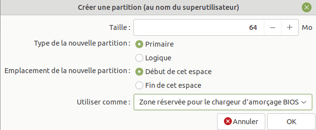 | /dev/sda2 | inconnu | 64 Mo | Le bootloader GRUB est installé dans cette partition. Elle apparaît comme type "inconnu" dans GParted. Elle doit avoir le flag bios_grub. |