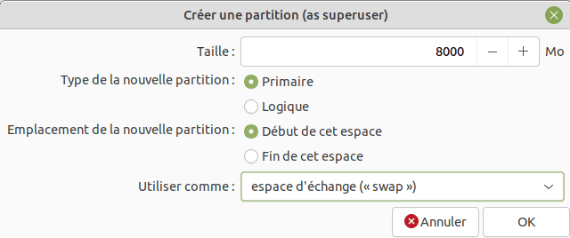 | /dev/sda3 | swap | 8 Go | Parcequ'il faut toujours une partition de swap (même si dans la pratique l'installation de zram fait qu'elle ne sera pratiquement jamais utilisée.). Je préfère une partition de swap plutôt que le fichier de swap qu'Ubuntu créé par défaut. |