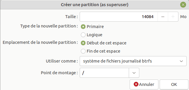 - Laisser sur le disque par défaut (la partition btrfs)
